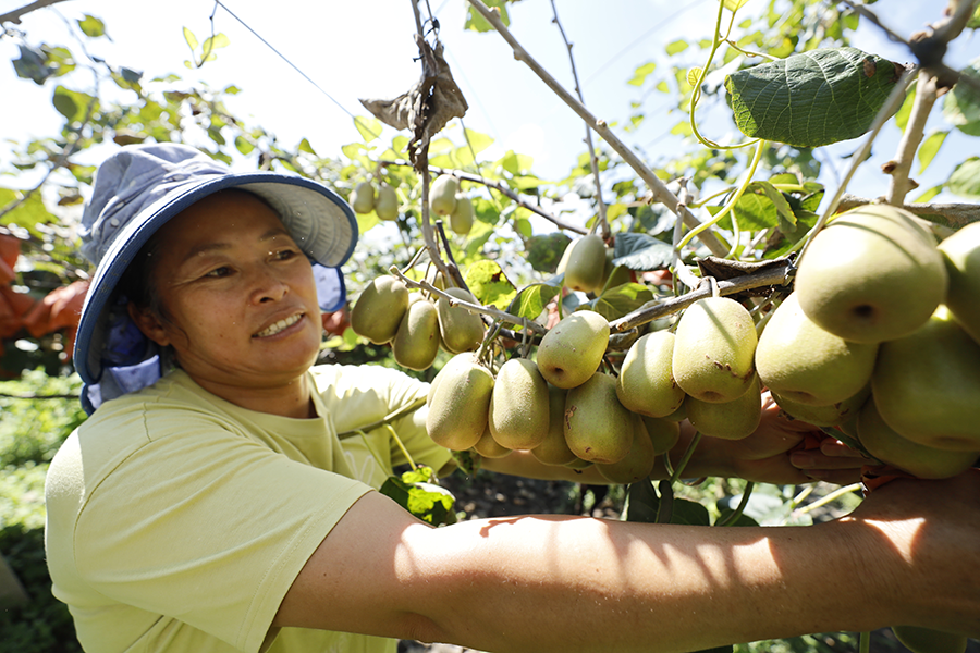 大批獼猴桃即將成熟,農戶正在為果子摘套。