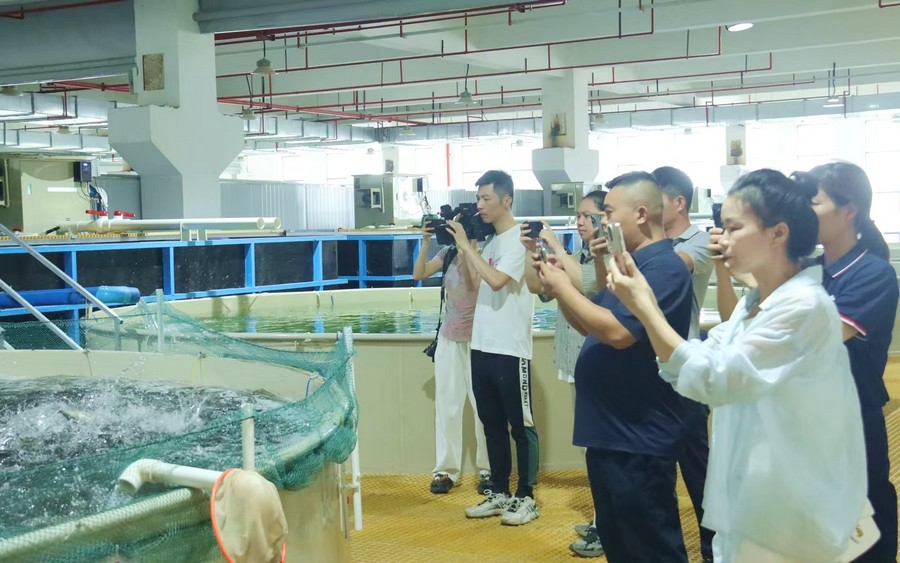 在廣西南科重工機械有限公司廠房,機器運轉的轟鳴聲鏗鏘有力,采風團了解設備研發歷程、核心技術及應用場景;在廣西華芯數智科技有限公司現代循環水漁業養殖基地,AI智能養殖技術成果直觀展現。