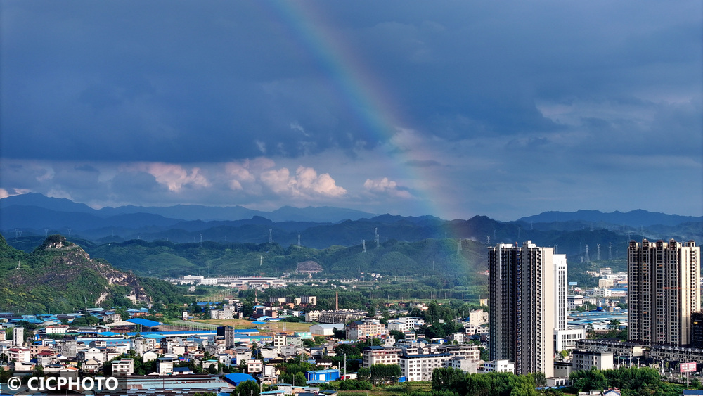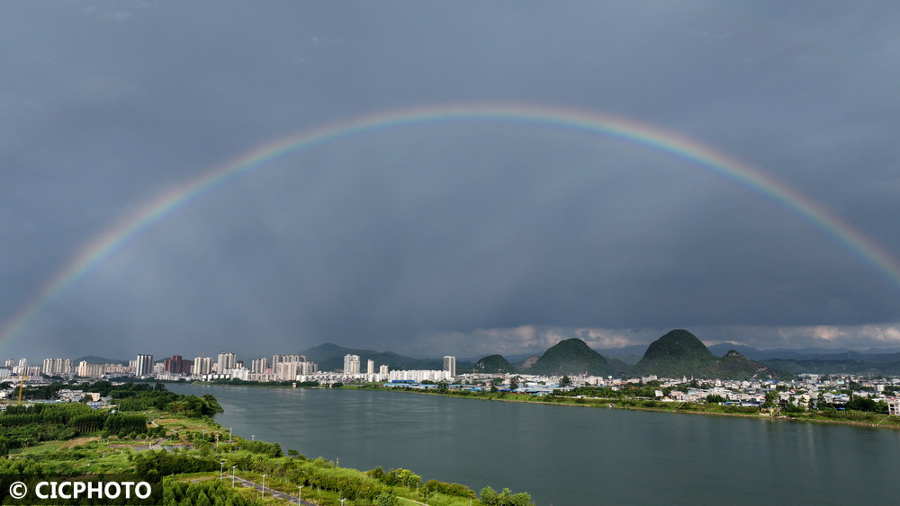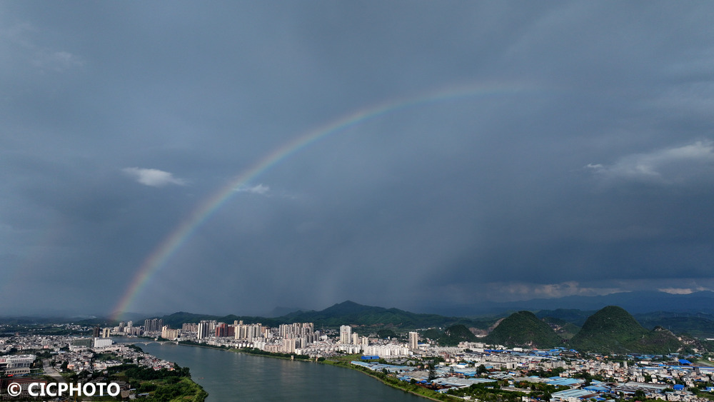 2025年9月11日午后,一場陣雨突襲廣西柳州市融安縣,給燥熱的大地帶來了一絲清涼。陣雨過后,融安縣城的天空中架起了一道色彩鮮艷、邊界清晰的絢麗彩虹,為桂北秋日增添一道靚麗的風景。