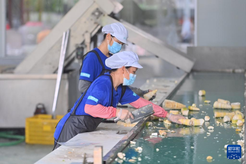 在柳州筍丫頭農業有限公司,工人在加工竹筍,準備生產螺螄粉原材料——酸筍(7月11日攝)。