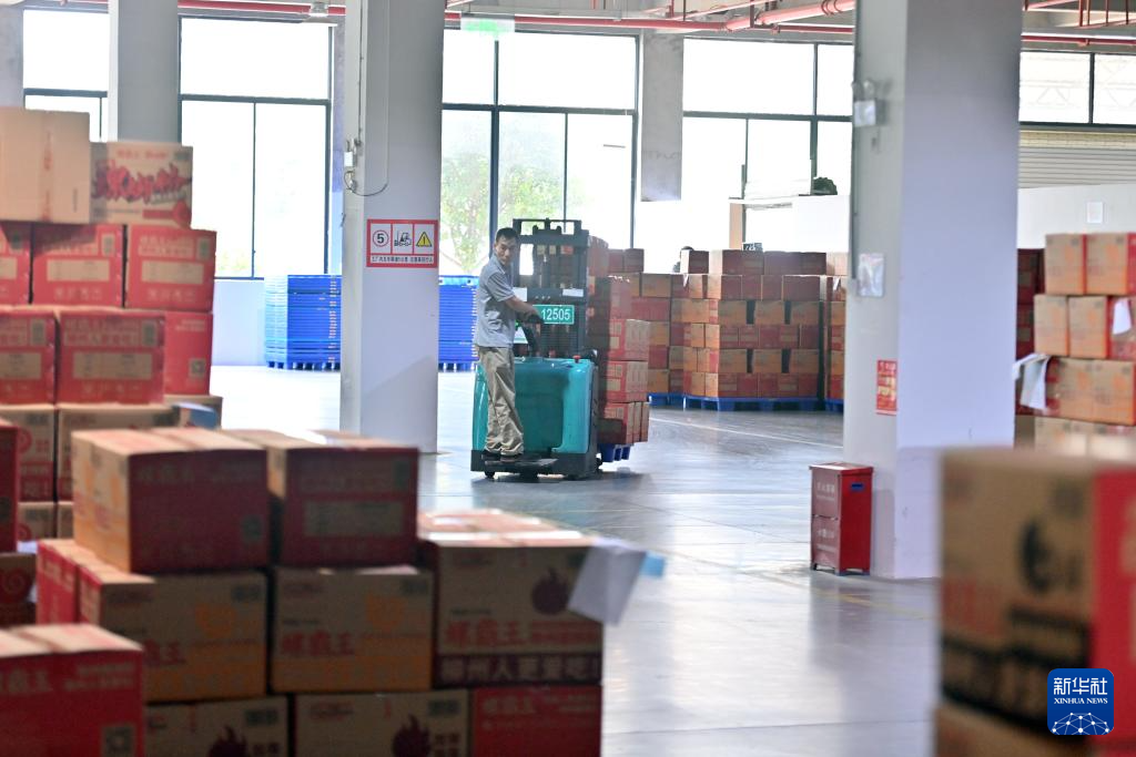 在廣西螺霸王食品科技有限公司螺螄粉倉庫,工人在搬運螺螄粉產品(9月9日攝)。