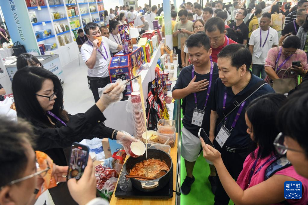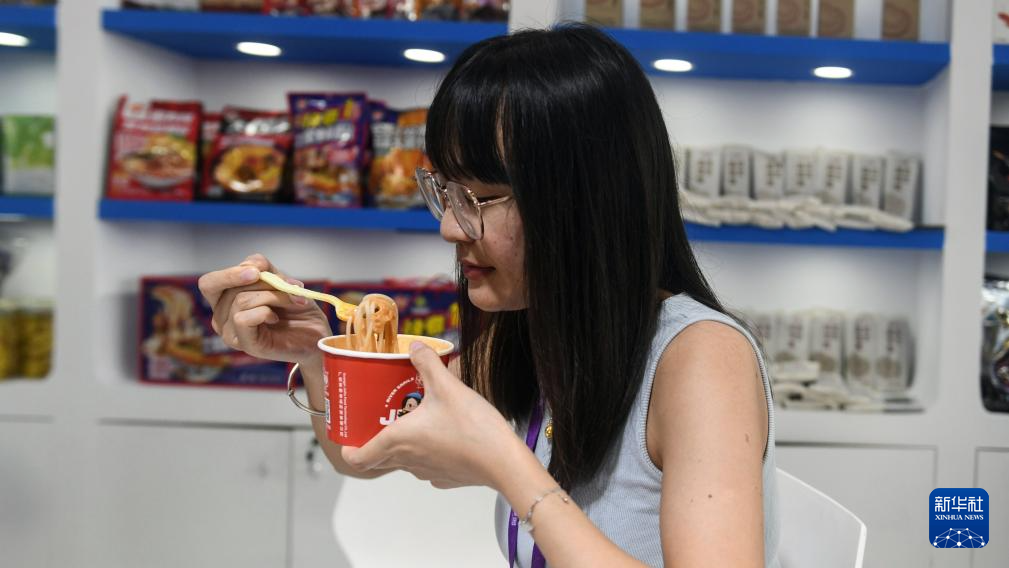 在南寧國際會展中心一家螺螄粉企業展位,參觀者準備品嘗柳州螺螄粉(9月17日攝)。
