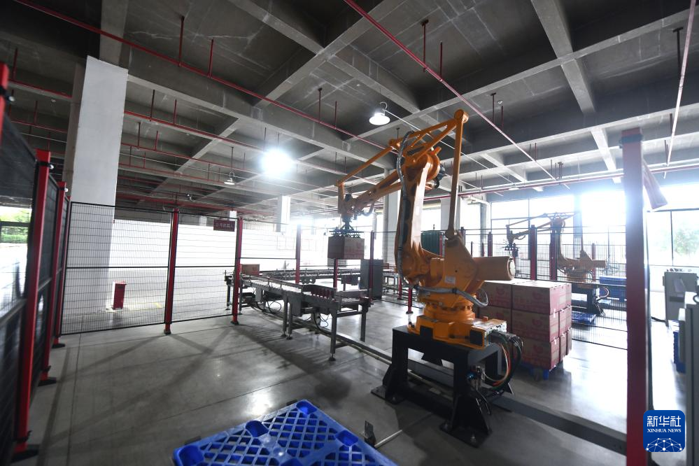 在廣西螺霸王食品科技有限公司螺螄粉倉庫,機器人在打包螺螄粉產品(9月9日攝)。