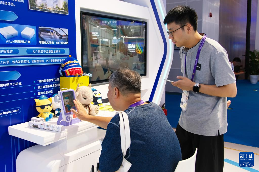 9月19日,在南寧國際會展中心,參觀者體驗一款裸眼3D的AI兒童陪伴機器人。