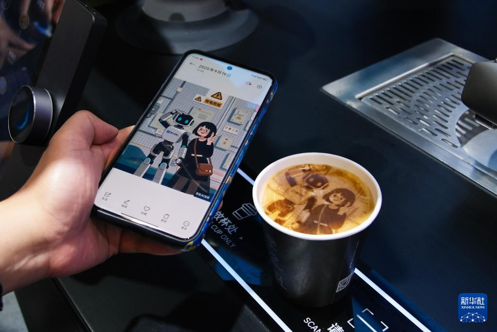 9月19日,在南寧國際會展中心,參觀者展示一款由咖啡機器人制作的咖啡拉花。