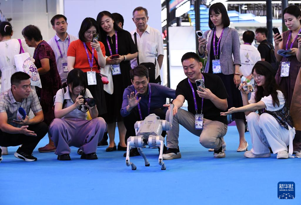 9月19日,在廣西南寧國際會展中心,機器狗與參觀者互動。