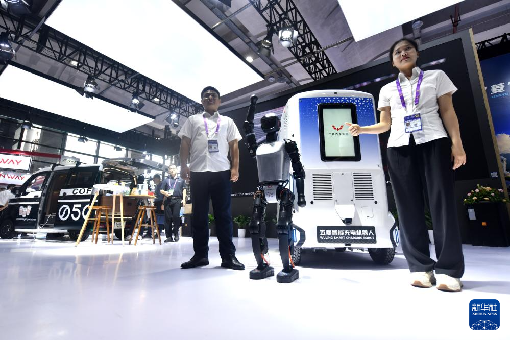 9月19日在南寧國際會展中心拍攝的一臺智能充電機器人。