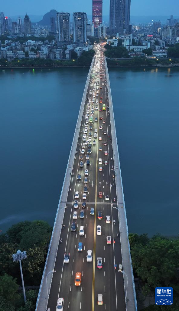 汽車行駛在廣西柳州市文昌大橋上,其中部分為柳州產的新能源汽車(9月8日攝,無人機照片)。
