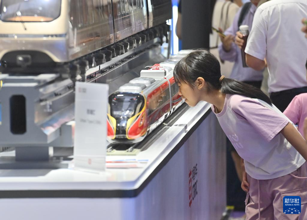 9月20日,在廣西南寧國際會展中心,小朋友在參觀動車組模型。