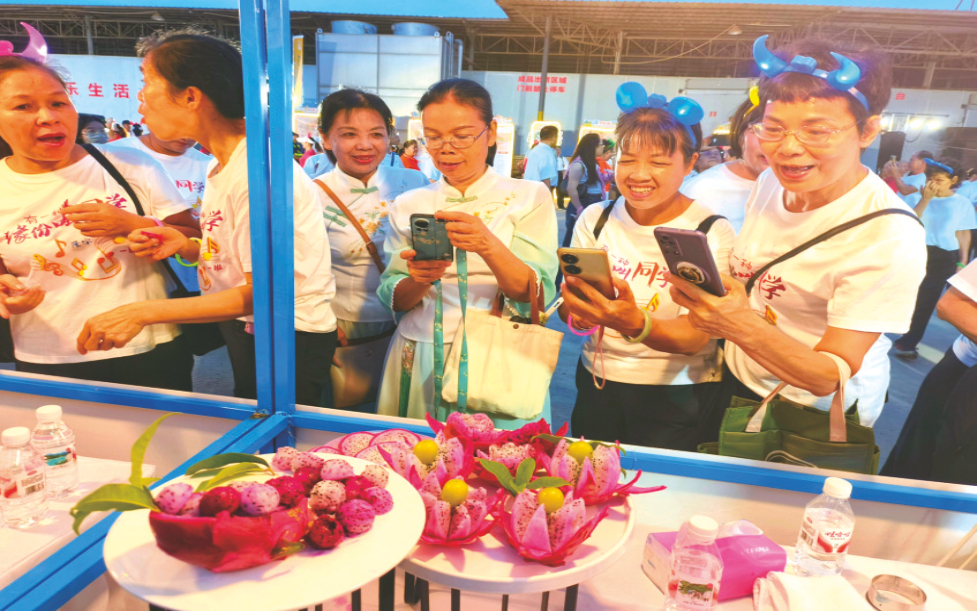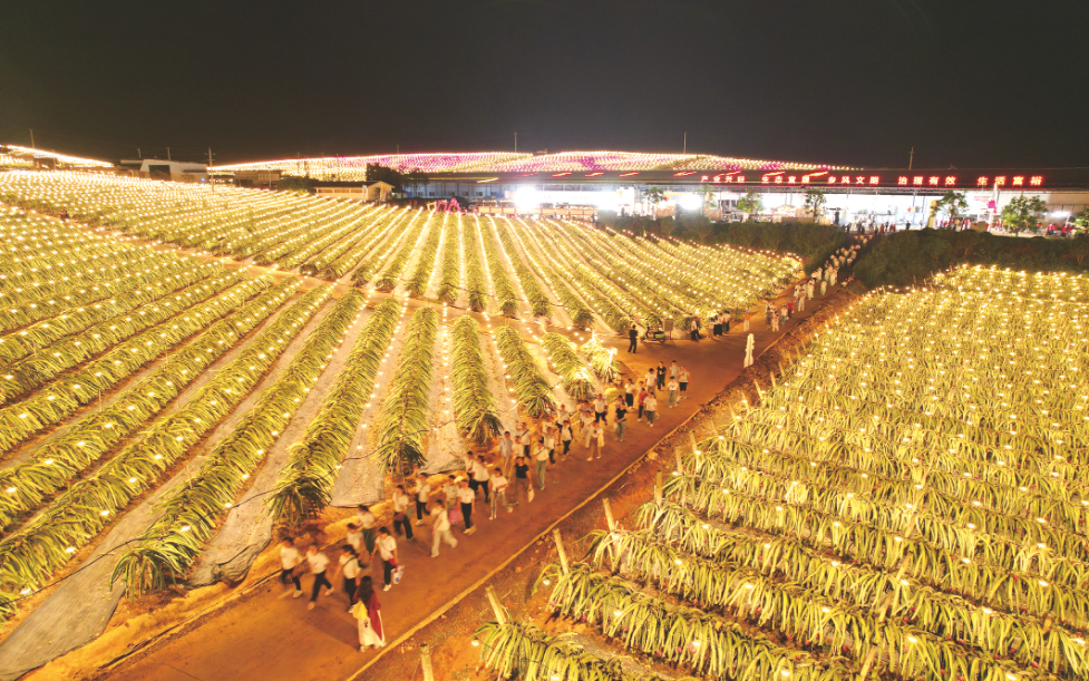 “眼睛和味蕾都忙不過來?!庇慰屠钆空f,萬畝火龍果燈海突然亮起,好像星河墜落人間,十分震撼。她忍不住拿出手機拍個不停,每一張都是氛圍感大片。水果美食展位更讓人驚喜,連空氣里都飄著讓人開心的甜意。