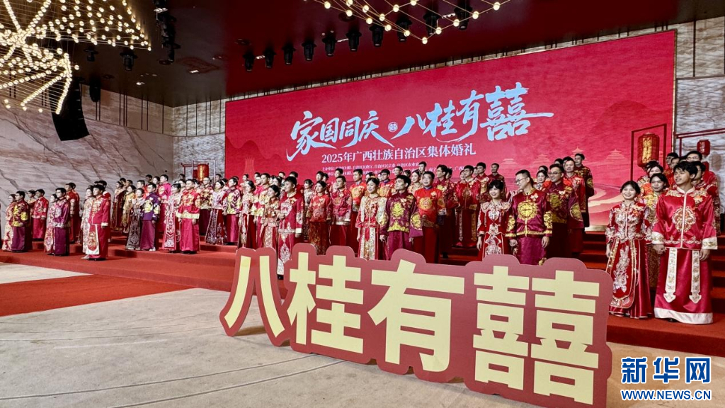新華網南寧9月28日電 26日,2025年“家國同慶 八桂有囍”集體婚禮在廣西南寧國際會展中心舉行,56對新人攜手參加婚禮儀式,近400名嘉賓與新人家屬到場見證。