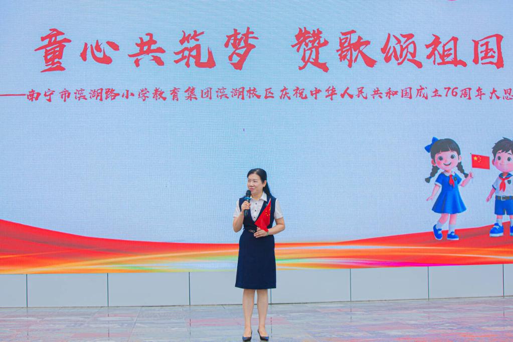 在理想大課堂講話中,南寧市濱湖路小學黨委書記謝小燕及各校區常務副校長帶領師生回顧了中華民族奮斗史,勉勵同學們要銘記歷史、心懷感恩,把愛國之情化作學習的動力與行動的力量。