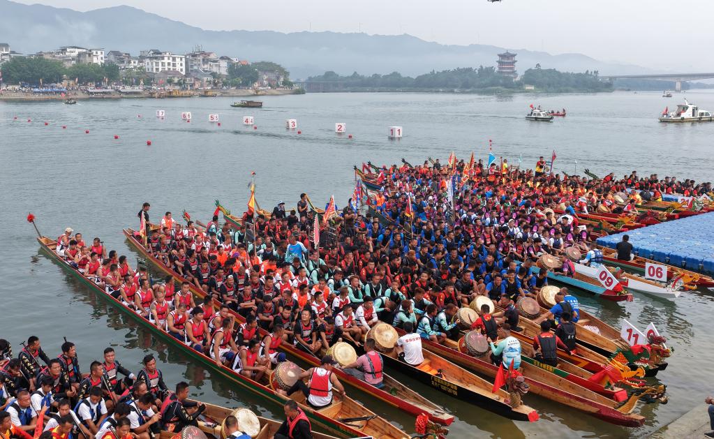 1日,2025年廣西融安龍舟公開賽暨第二十四屆長安龍舟大賽在融江上激烈進行。江面龍舟競渡,兩岸觀眾吶喊助威,氣氛熱烈。
