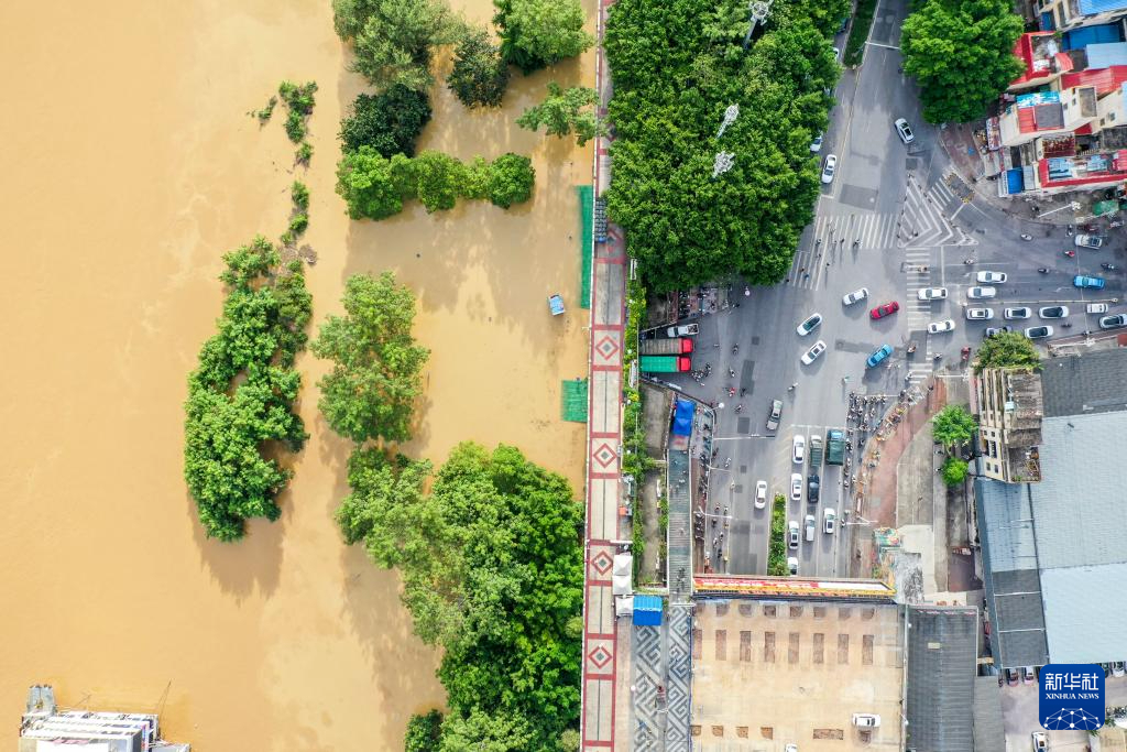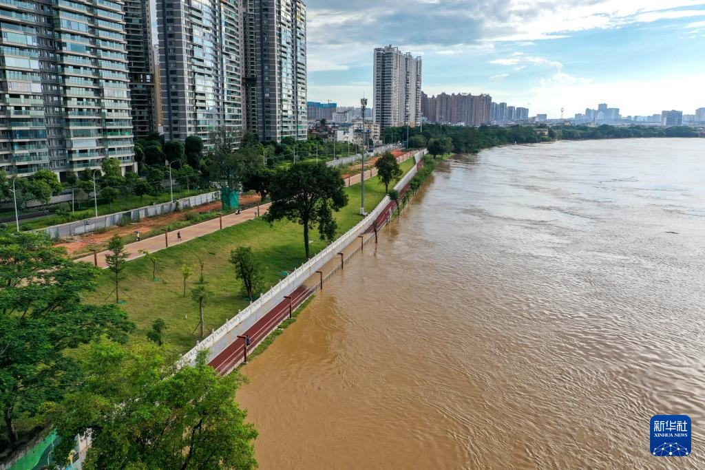 10月3日,郁江廣西南寧城區河段(邕江)水位持續上漲,部分江邊步道被淹(無人機照片)。
