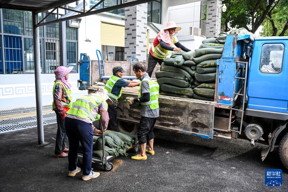 10月3日,南寧市水利部門的工作人員在搬運應急防汛沙包。