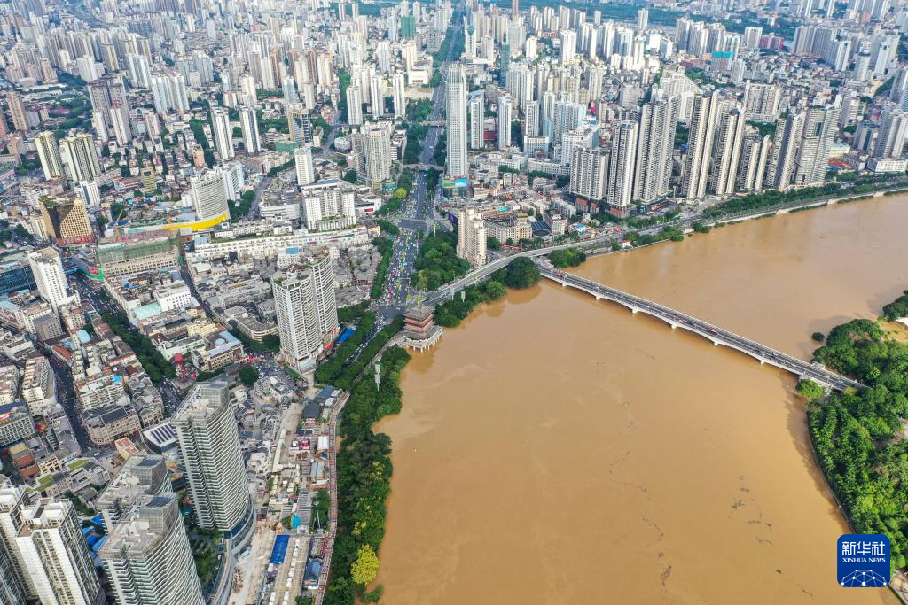 10月3日,郁江廣西南寧城區河段(邕江)水位持續上漲(無人機照片)。