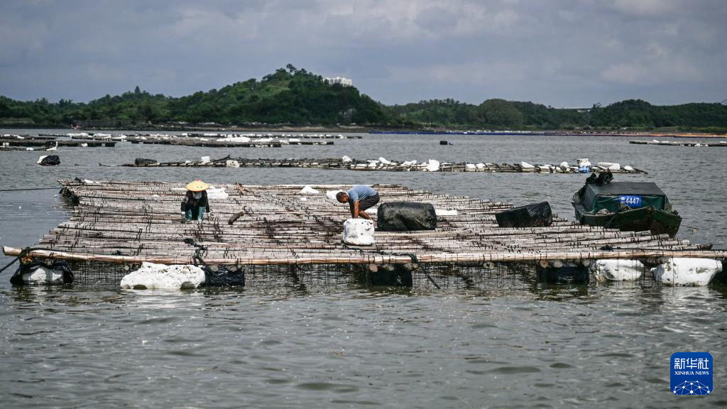 10月7日,欽州市欽南區龍門港鎮南村村民在修補受損蠔排。