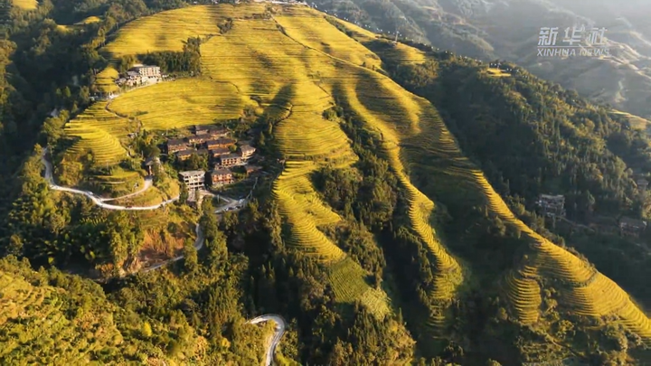 國慶中秋假期,廣西桂林市龍勝各族自治縣龍脊梯田水稻披金,層層疊疊的金黃稻田,吸引了世界各地的游客前來觀賞。