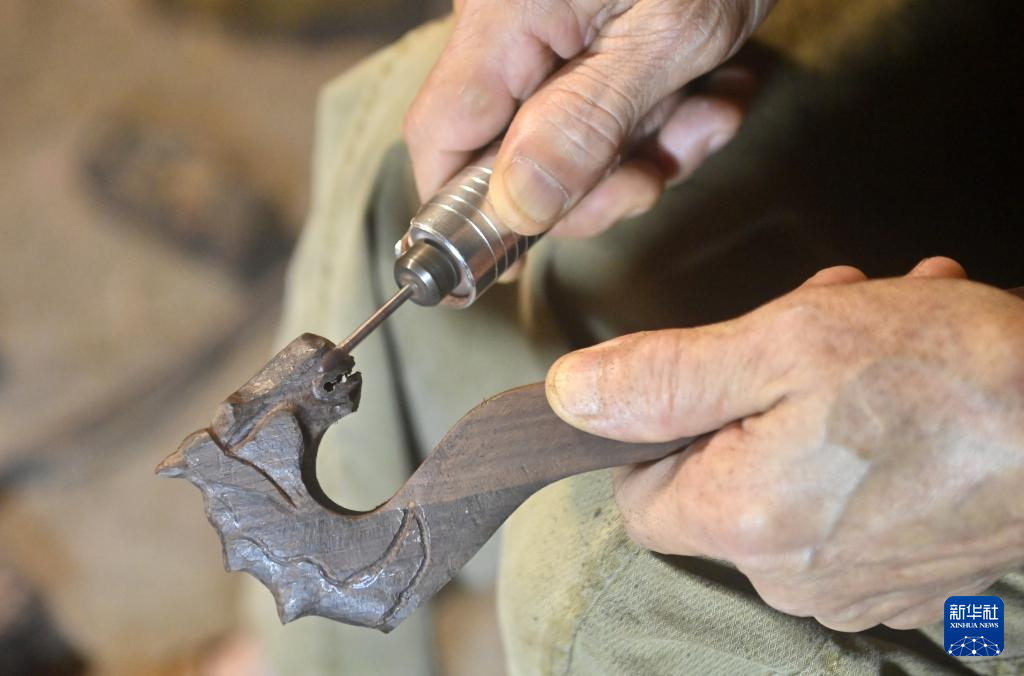 10月10日,黃一格在家中雕刻一把馬骨胡的琴頭。