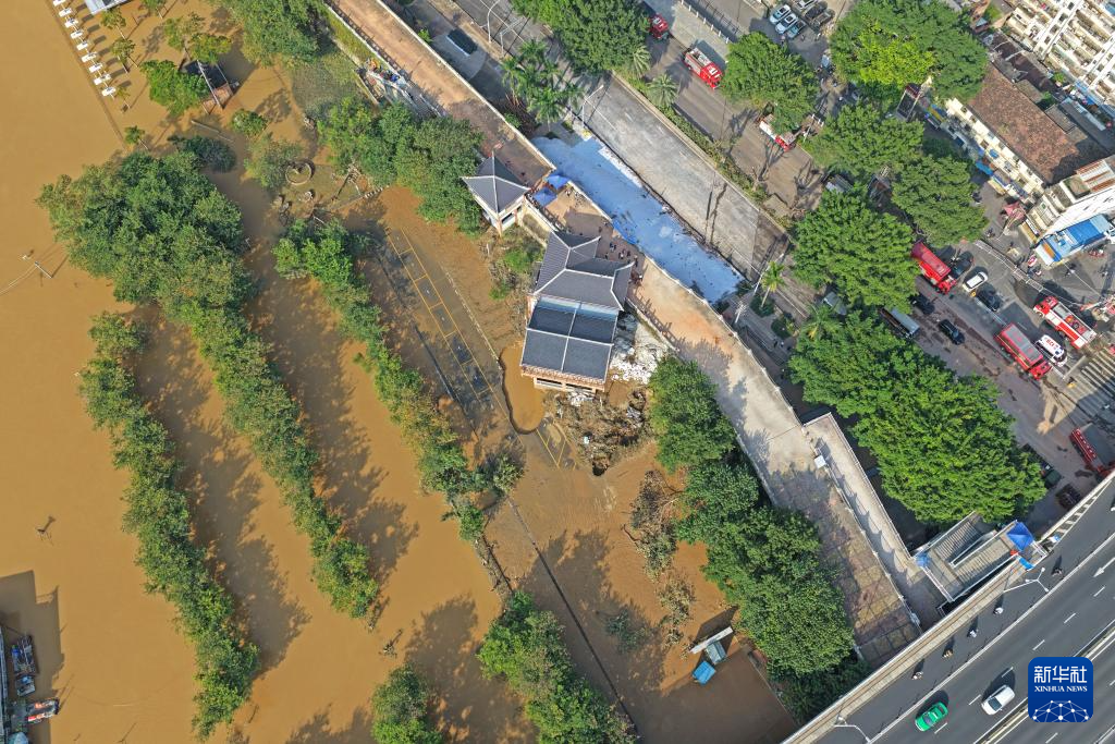 10月12日拍攝的廣西南寧市北大橋右側堤外停車場二坑泵站路面塌陷區(無人機照片)。該區域險情已基本解除。