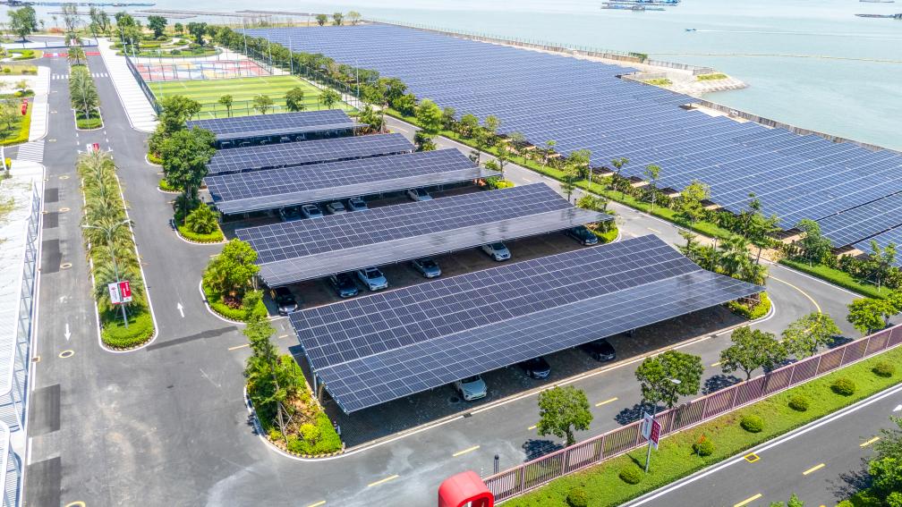 為探索從常規能源向綠色低碳能源轉型路徑,國能北海公司充分利用廠區空地、屋頂資源,建設27.29MWp分布式光伏項目,于2024年12月正式投產。該項目無需占用額外土地,通過融合“光伏車棚+智能充電樁”的復合模式,一排排光伏板既為廠區供電,也為員工的電動車、汽車提供清潔電能。據測算,該項目年均發電量可達3302.22萬千瓦時,與相同發電量的火電相比,每年可節約標煤1.032萬噸,相應每年減少排放溫室效應氣體、CO2約3.318萬噸,減少排放大氣污染氣體S02約998.3噸、NOx約499.14噸,減少化石資源的消耗,有利于緩解環境保護壓力,實現經濟與環境的協調發展。