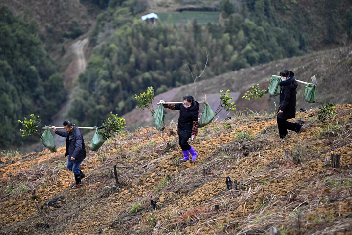 在廣西柳州市三江侗族自治縣八江鎮,人們挑著油茶苗準備上山種植。新華社發 黎寒池 攝