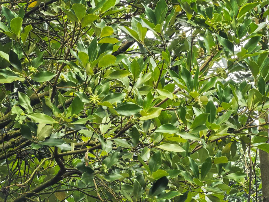 六萬林場的八角樹上,八角果實掛滿枝頭。新華社記者王楚然 攝