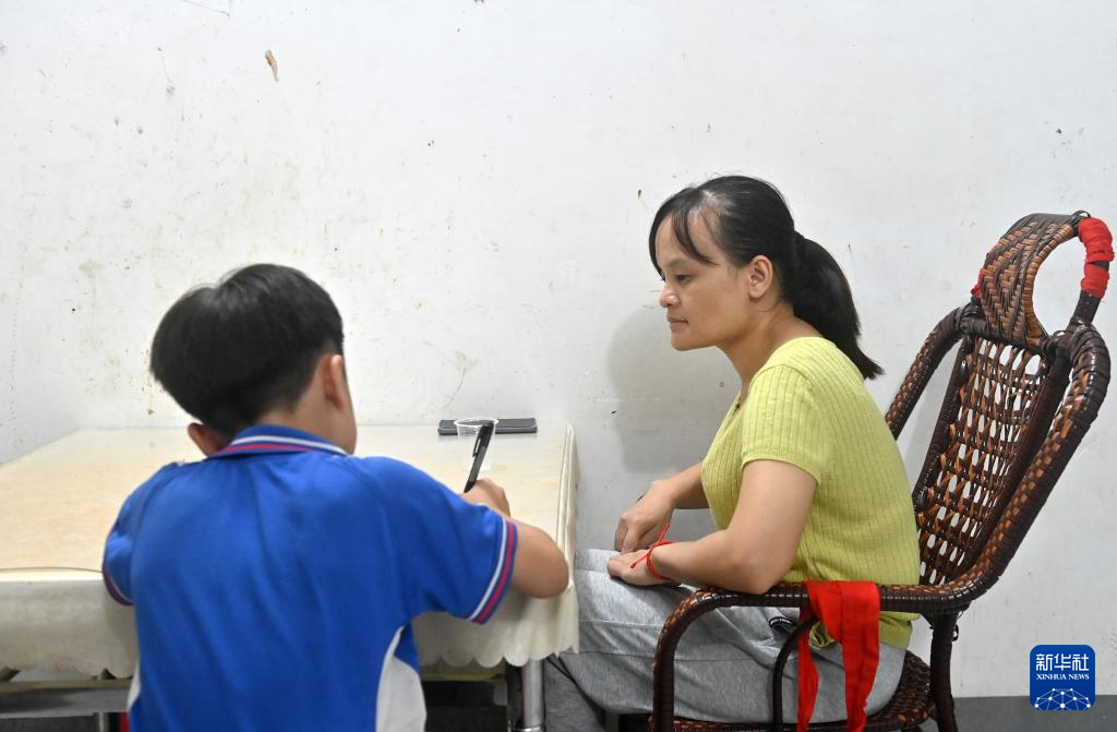 10月13日,在廣西鳳山縣鳳城鎮廉租住房里,藍野針陪著小兒子復習功課。
