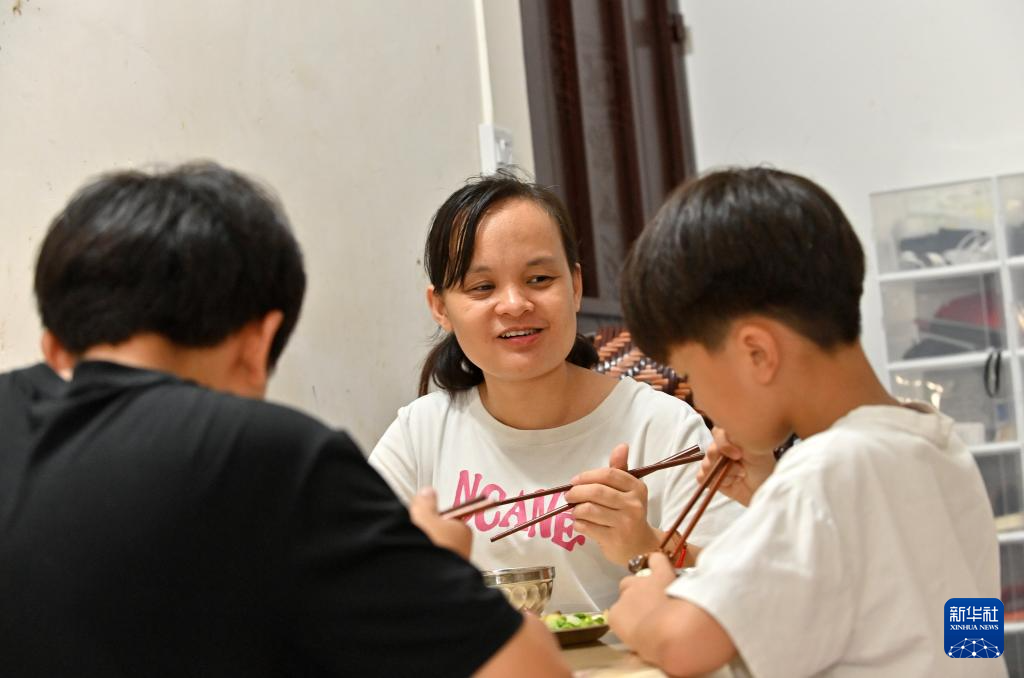 10月14日,在廣西鳳山縣鳳城鎮廉租住房里,藍野針和兩個兒子吃午飯。