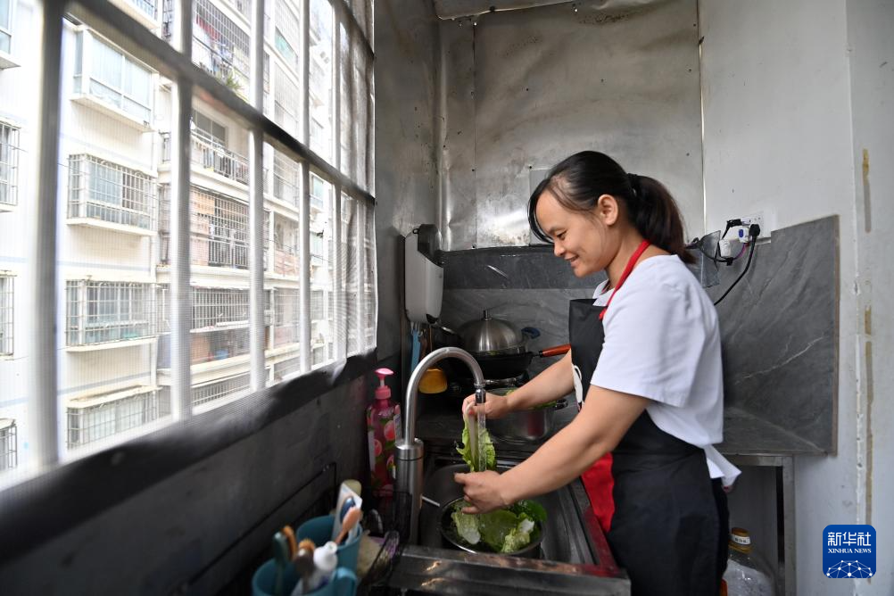 10月14日,在廣西鳳山縣鳳城鎮廉租住房里,藍野針在洗菜準備做飯。