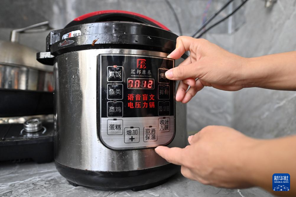 10月14日,在廣西鳳山縣鳳城鎮廉租住房里,藍野針用語音盲文電壓力鍋煮飯。