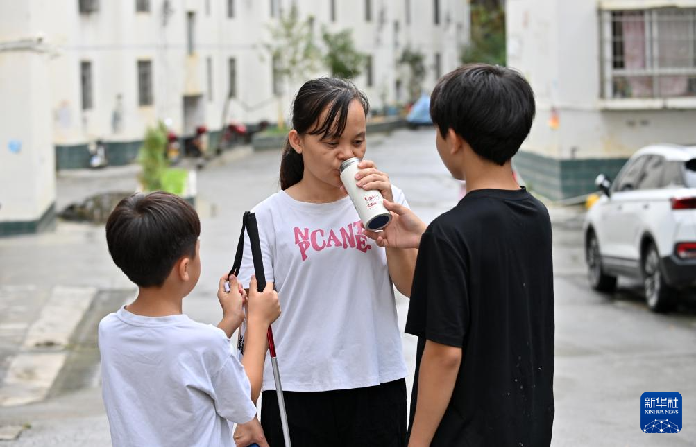 10月14日,在廣西鳳山縣鳳城鎮廉租房小區,藍野針和兩個兒子在散步時喝水。