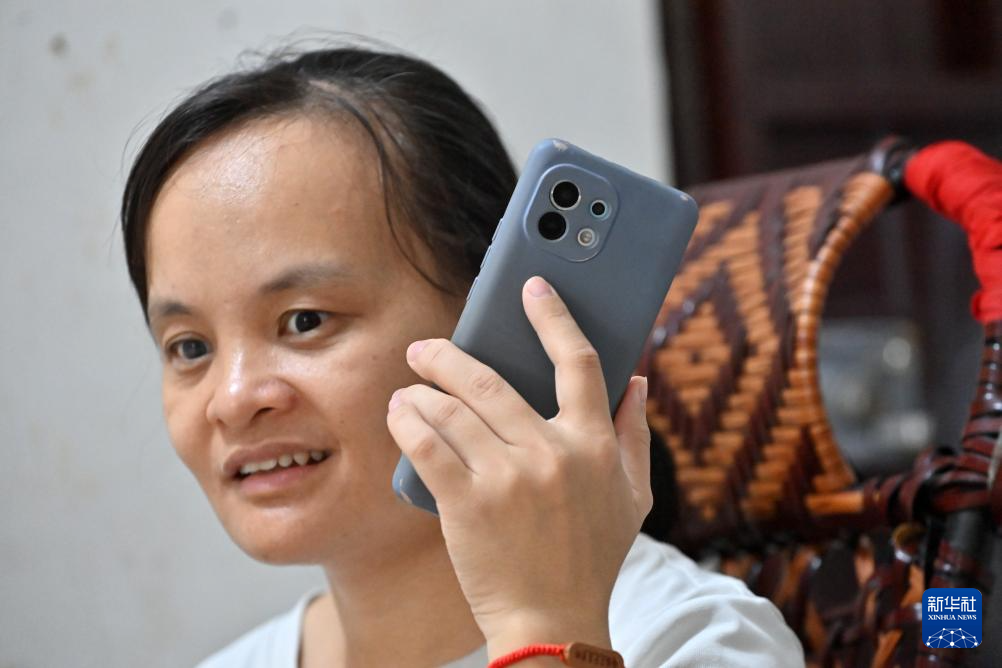10月14日,在廣西鳳山縣鳳城鎮廉租住房里,藍野針用手機聽文學作品朗讀。