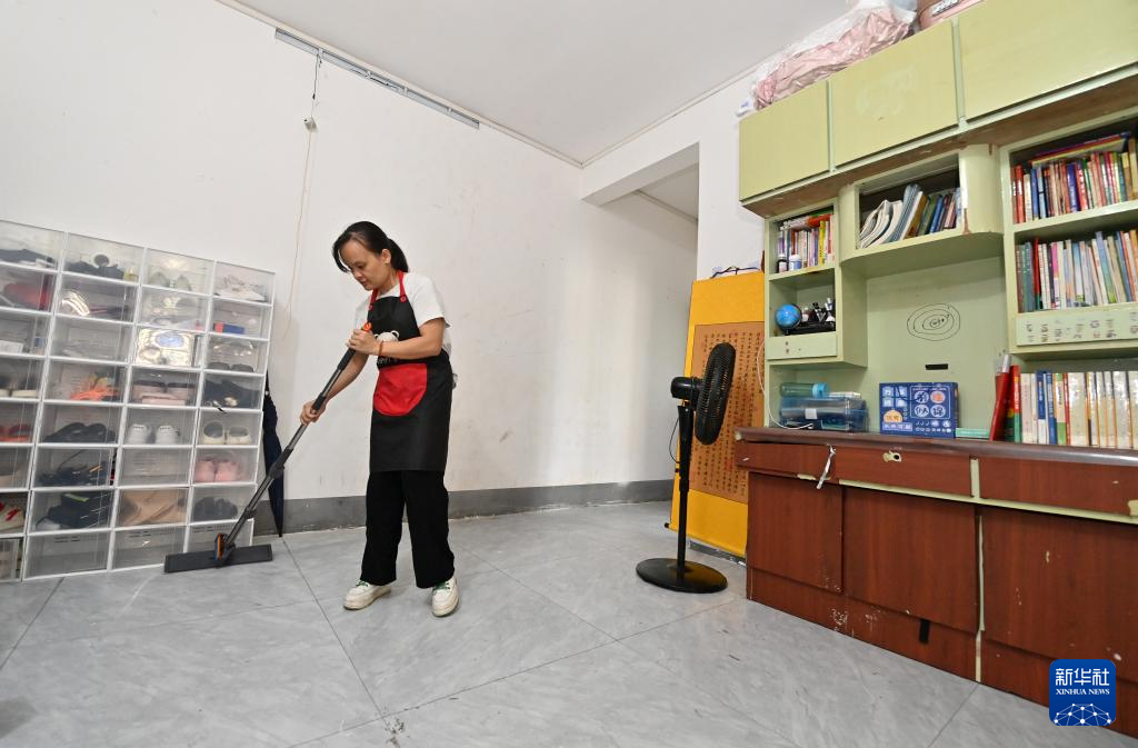 10月14日,在廣西鳳山縣鳳城鎮廉租住房里,藍野針在拖地。
