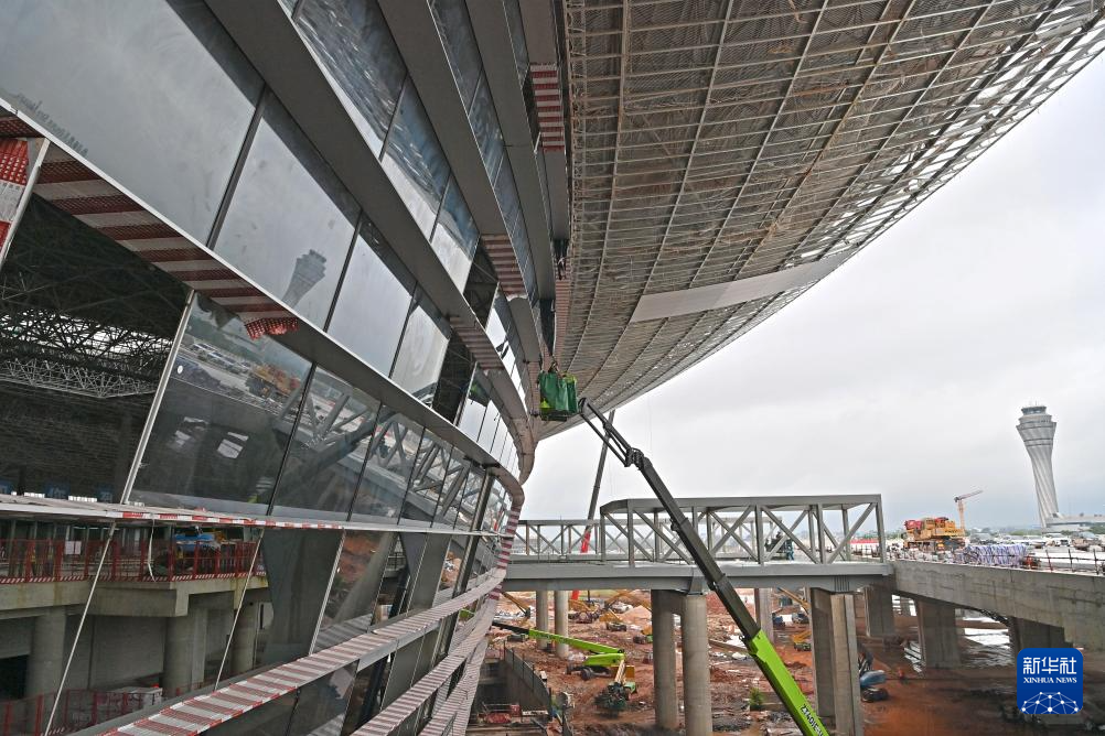 10月15日,中建二局的建設者在南寧吳圩國際機場T3航站樓二標段揭去玻璃幕墻鋼構上的塑料膜。