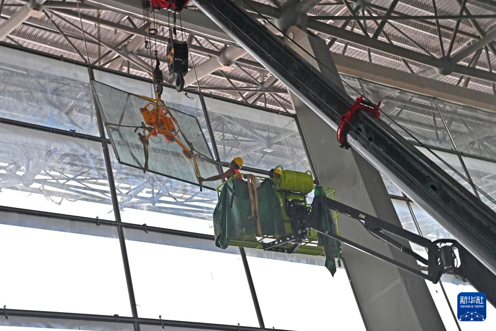 10月15日,中建二局的建設者在南寧吳圩國際機場T3航站樓二標段安裝玻璃。