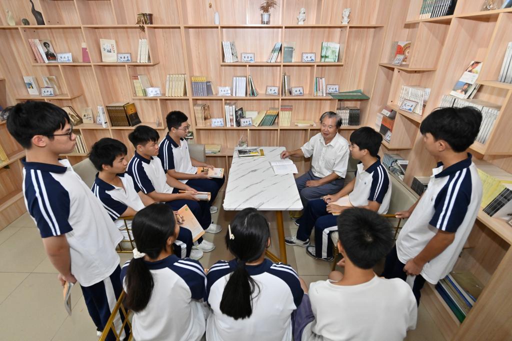 10月15日,在廣西河池市巴馬民族師范學校麒麟山文學館,羅伏龍在和學生談文學創作。新華社記者陸波岸 攝