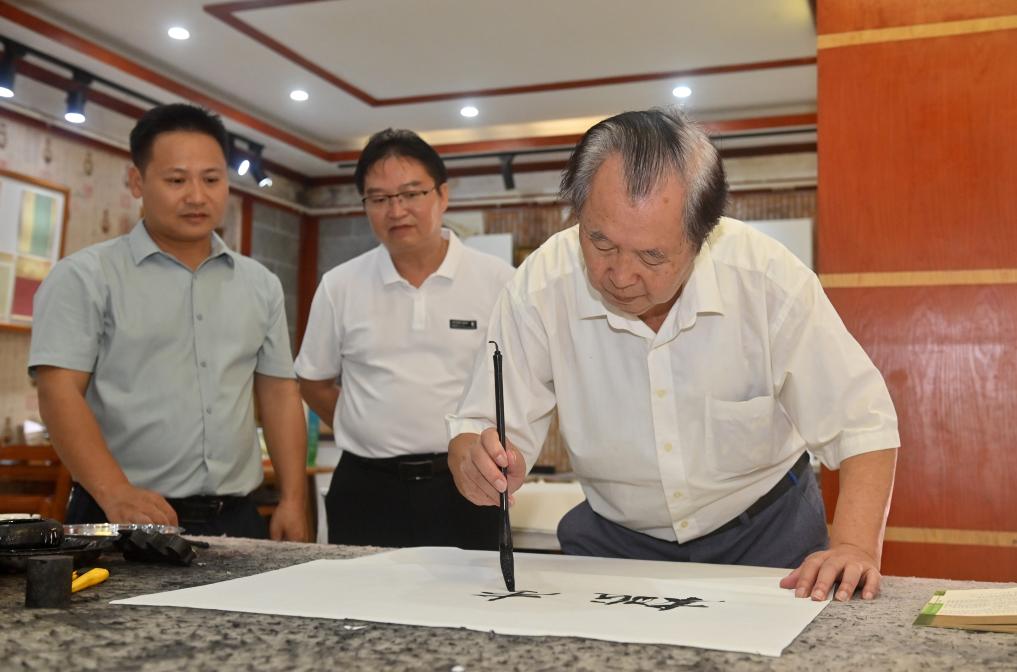 10月15日,在廣西河池市巴馬民族師范學校麒麟長壽養生書畫苑,羅伏龍(右一)在練習書法。新華社記者陸波岸 攝