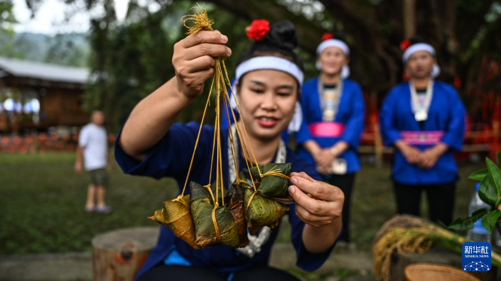 10月17日,在良口鄉產口村活動現場,一名侗族婦女在整理制作的粽子。