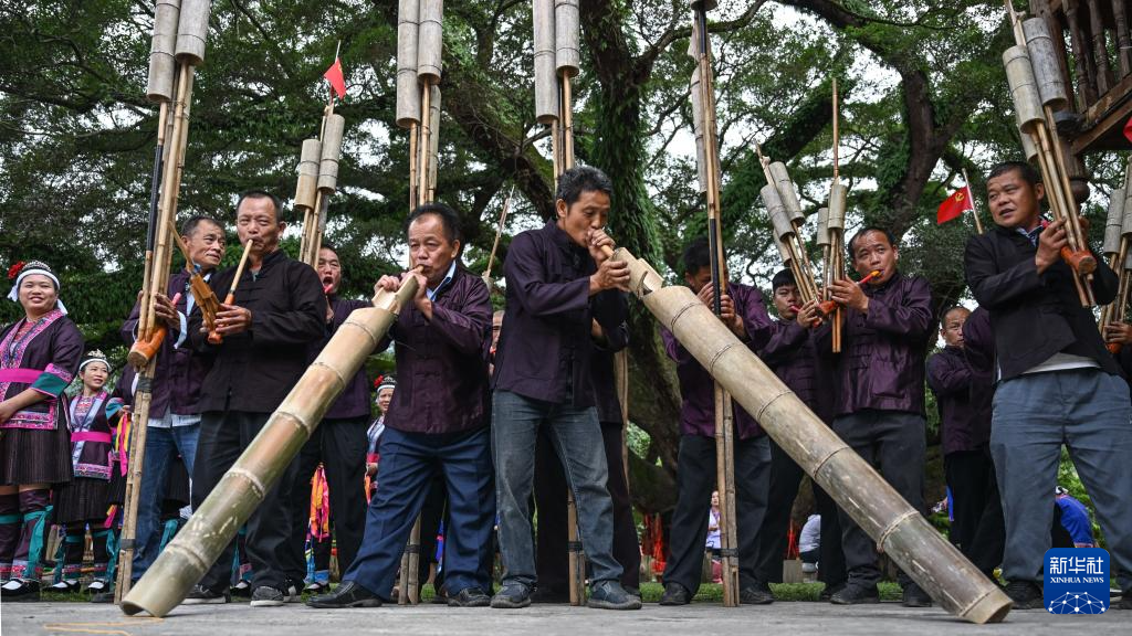 10月17日,在良口鄉產口村活動現場,侗族群眾吹奏蘆笙迎賓客。
