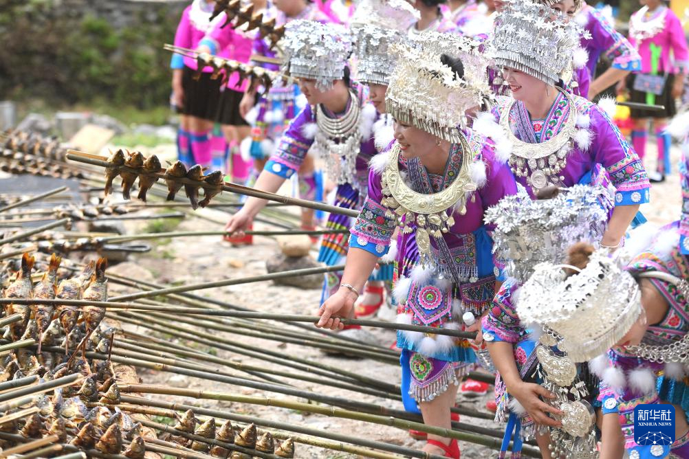 10月18日,在柳州市融水苗族自治縣安太鄉培秀村,村民們整理剛剛燒好的魚。