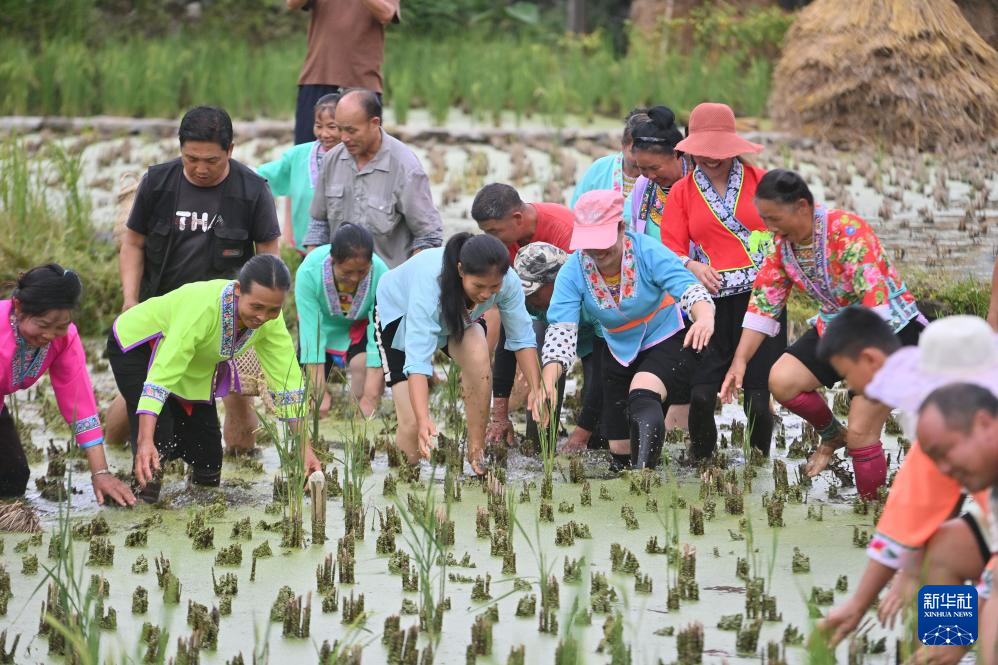 10月18日,在柳州市融水苗族自治縣安太鄉培秀村稻田里,村民們進行抓魚比賽。