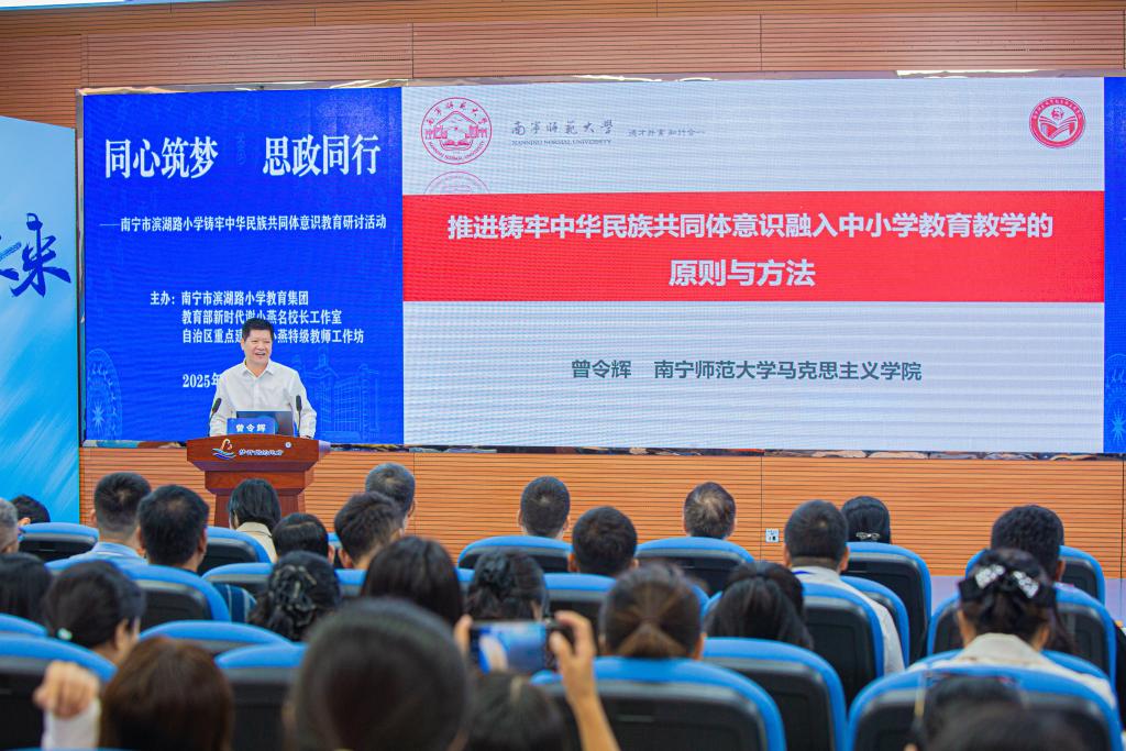 在交流研討環節,南寧市濱湖路小學黨委書記謝小燕以《讓夢想啟動未來——南寧市濱湖路小學從“我的夢”到“中國夢”的大思政育人體系》為題作主旨發言,從學校實踐和理論研究雙維度,分享以“大思政課”鑄牢中華民族共同體意識的濱湖實踐;南寧師范大學馬克思主義學院院長曾令輝以《推進鑄牢中華民族共同體意識融入中小學教育教學的原則與方法》為題作主旨發言。