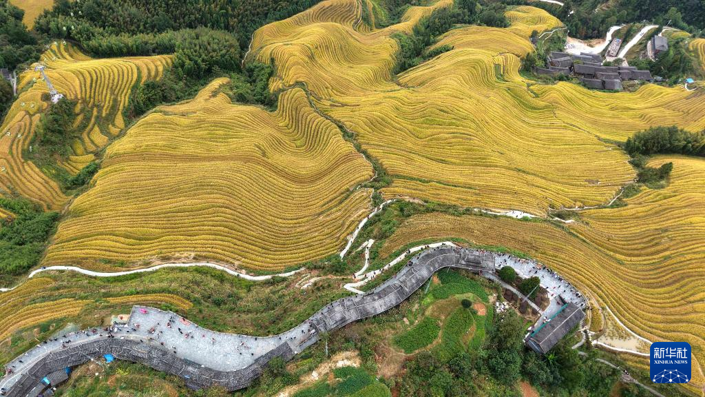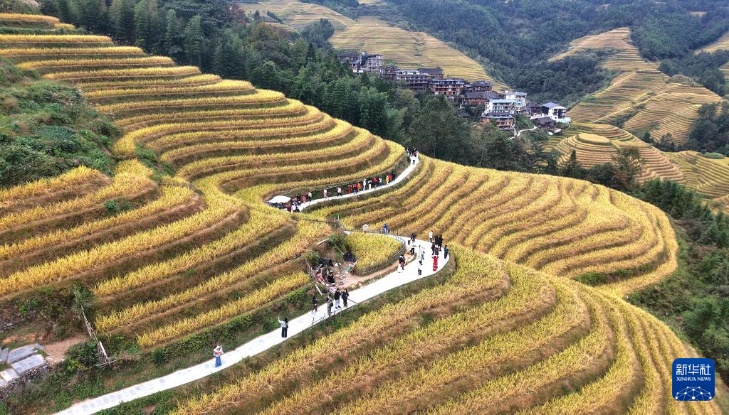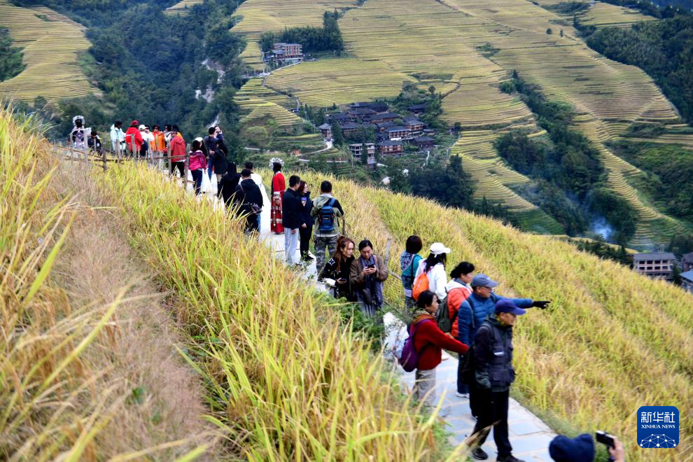 眼下,廣西龍勝各族自治縣龍脊梯田一片金黃,成為眾多游客觀光“打卡”的熱門景點。龍脊梯田已有2300多年歷史,是聯合國糧農組織認證的全球重要農業文化遺產。