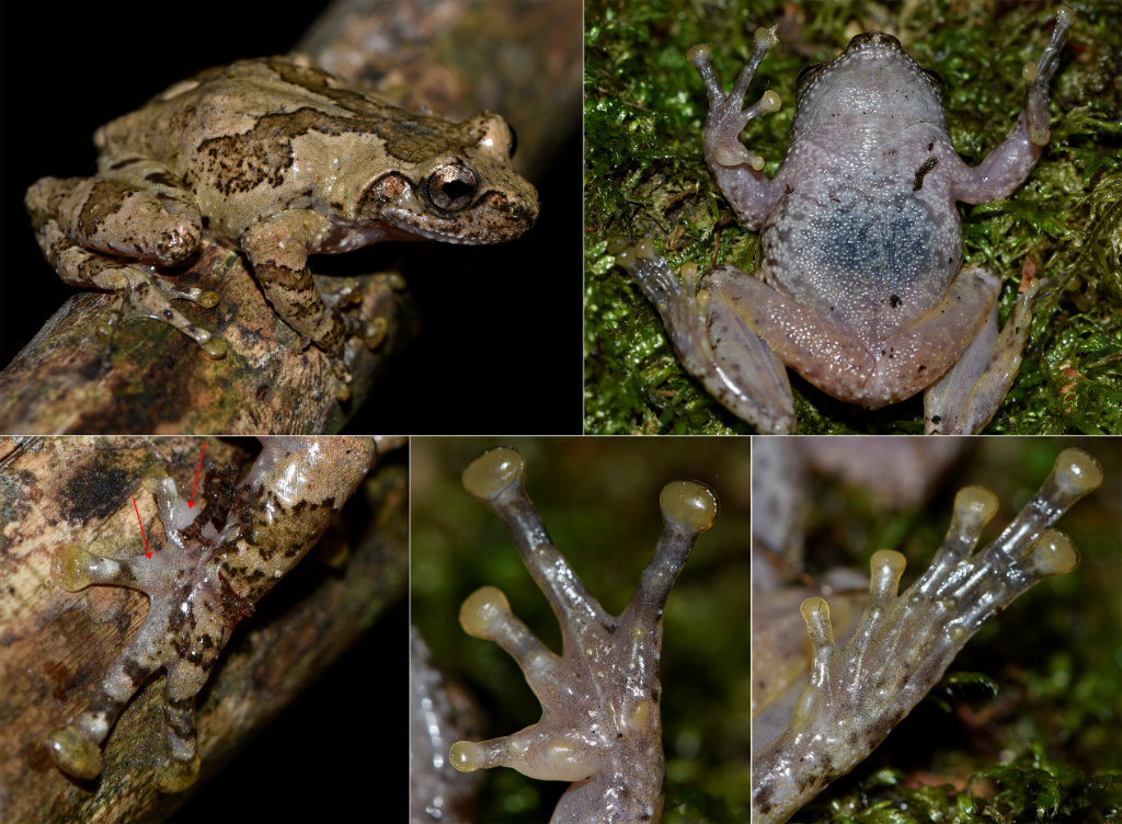 研究團隊成員、廣西師范大學生命科學學院碩士研究生潘元強介紹,劉三姐纖樹蛙體型較小,雄性體長27.5至33.2毫米,雌性體長38.1至39.7毫米;體背面淺褐色或深褐色,有一深褐色倒Y形斑;背面皮膚粗糙,有少許疣粒;雄性具有內聲囊,繁殖期第一、二指的基部具白色婚墊,無雄性線。該新種棲息于貓兒山海拔1600米左右的竹林內,4月初開始進入繁殖季。