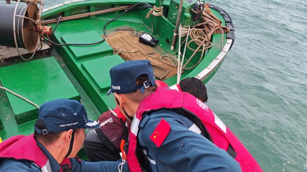 海警執法員到達現場時,發現漁船船尾已嚴重進水,船上2名漁民受困,船正在下沉,情況危急,海警執法員決定立即實施救援。