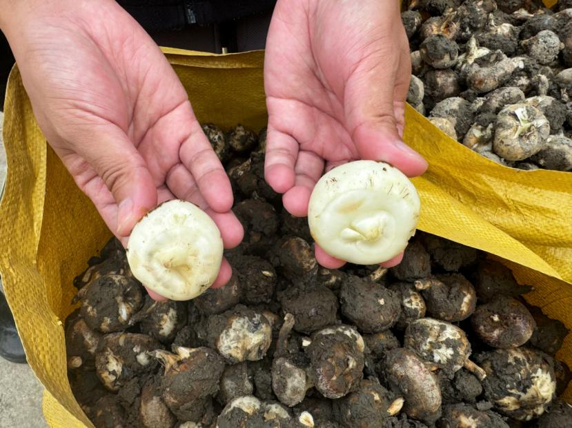 在賀州市八步區桂嶺鎮,工人在展示剛采收的馬蹄。趙文希 攝