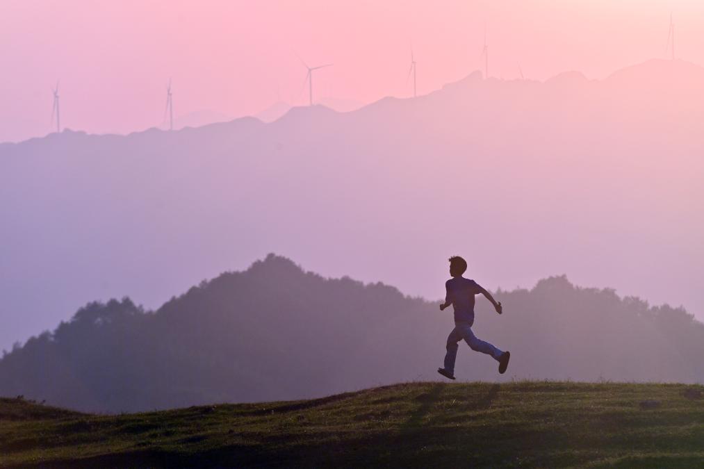 在廣西融水苗族自治縣桿洞鄉堯告村高山牧場,一名少年在夕陽下奔跑(2024年8月14日攝)。