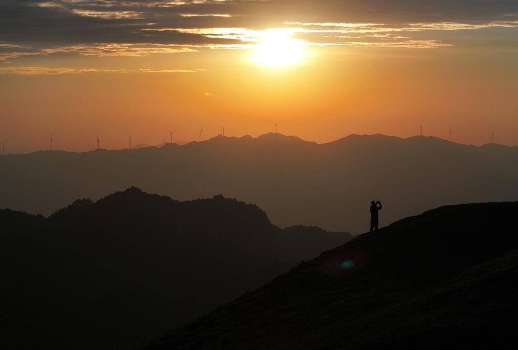 在廣西融水苗族自治縣桿洞鄉堯告村高山牧場,游客在欣賞日落景色(2024年8月15日攝)。