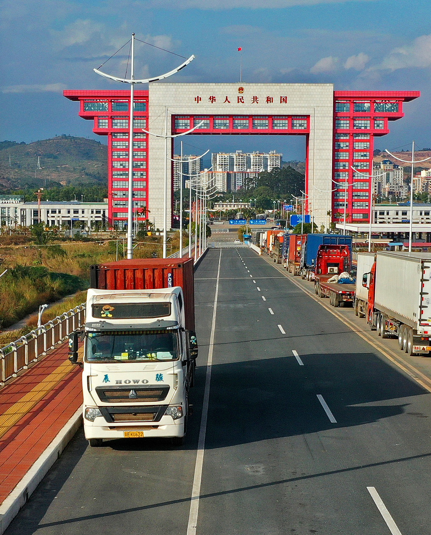 ③貨車有序進出東興口岸二橋國門樓。周軍/攝